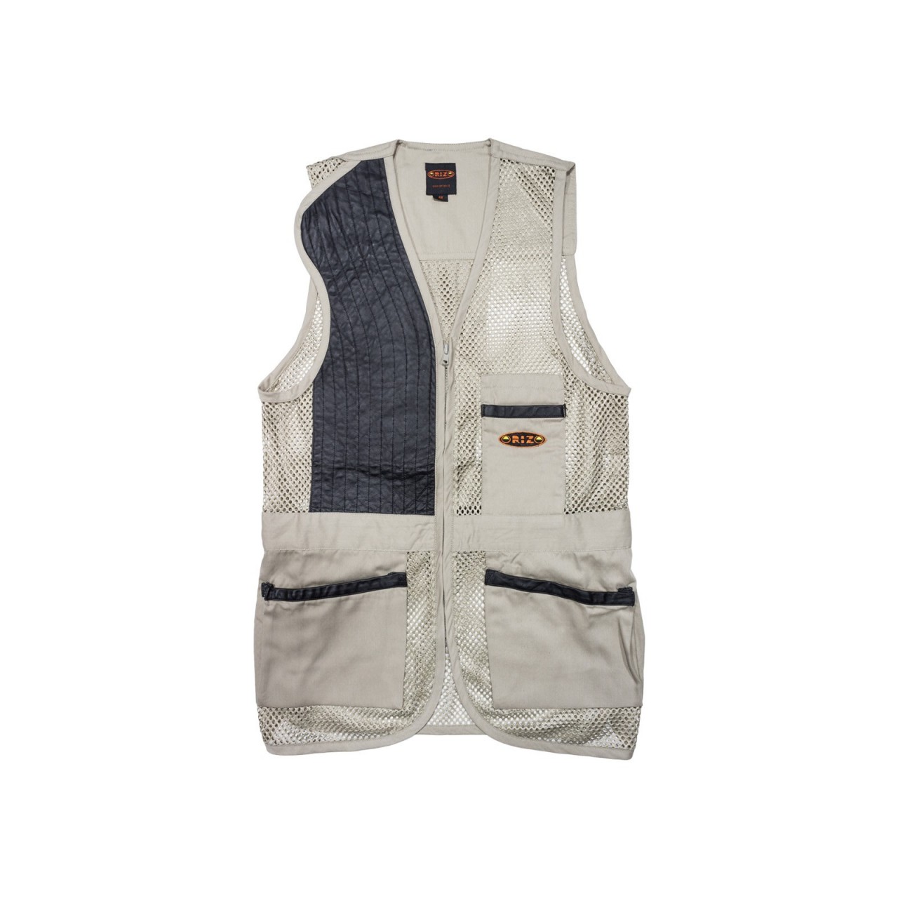 Gilet Marchiato Orizo realizzato in 100% poliestere tessuto a rete e tessuto 100% cotone da 240 gr/mq. Paracolpi in pelle che assicura adeguata protezione contro il rinculo e impunture antiscivolo, con uno spacco sulla parte superiore della spalla che consente maggiore spazio per l?appoggio del calcio del fucile. Ad altezza vita si trova un cinturino in tessuto di cotone che sul giro schiena contiene un elastico che permette, assieme agli spacchetti laterali, di ottimizzare la vestibilità. Chiusura frontale per mezzo di una zip a scomparsa, con due robuste e ampie tasche laterali a soffietto, bordate in pelle, che consentono di contenere un gran numero di cartucce e con, sulla parte sinistra sopra al cinturino, un taschino porta oggetti anch?esso bordato in pelle. Sul retro, in posizione che segue la colonna vertebrale, si trova una fascia di rinforzo in tessuto di cotone così come dello stesso materiale è composta la fascia che va dalla nuca alle spalle, spazio ideale per ospitare eventuali ricami personalizzati.