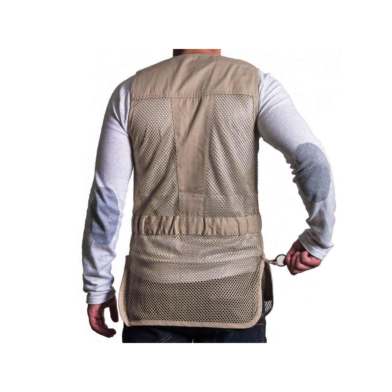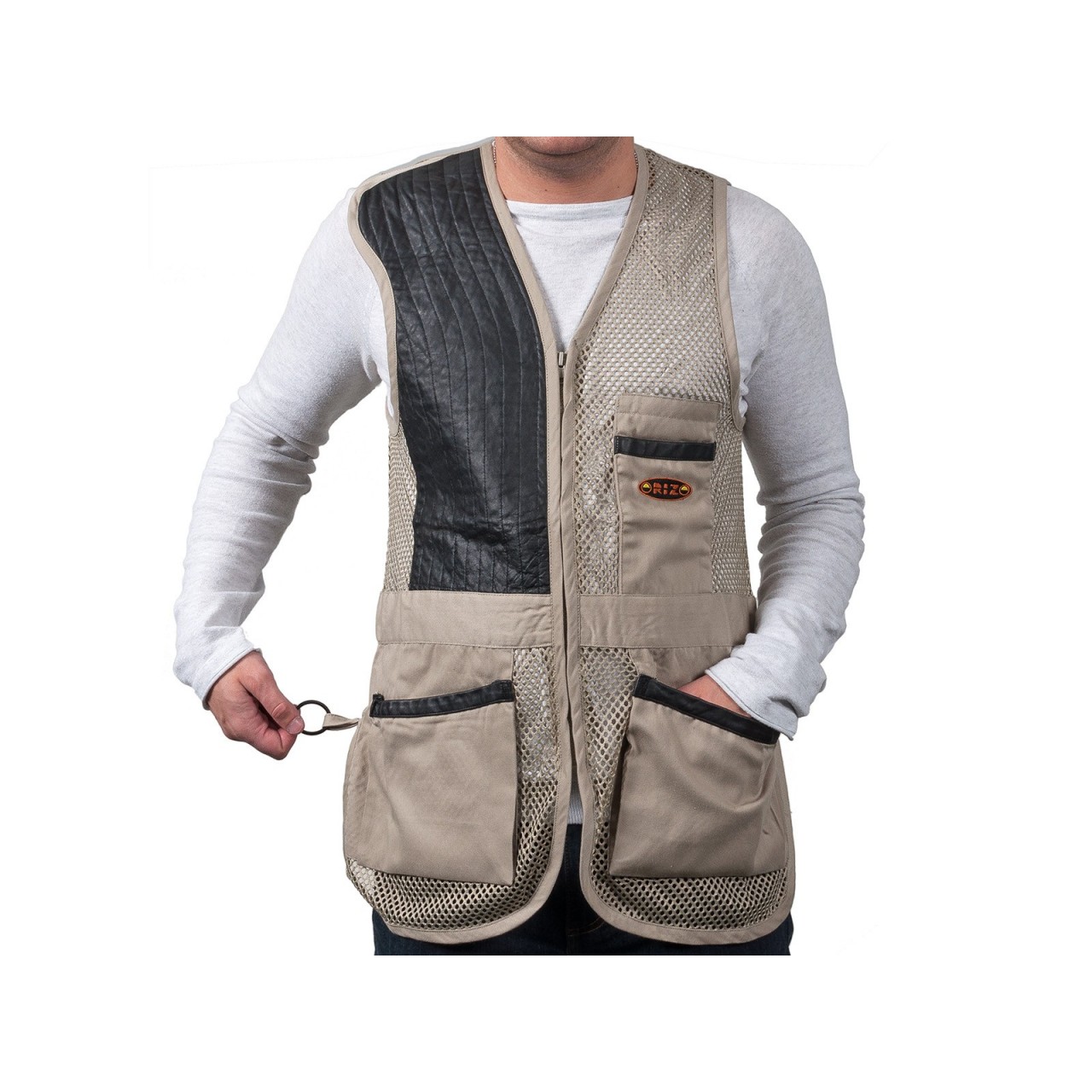 Gilet Marchiato Orizo realizzato in 100% poliestere tessuto a rete e tessuto 100% cotone da 240 gr/mq. Paracolpi in pelle che assicura adeguata protezione contro il rinculo e impunture antiscivolo, con uno spacco sulla parte superiore della spalla che consente maggiore spazio per l?appoggio del calcio del fucile. Ad altezza vita si trova un cinturino in tessuto di cotone che sul giro schiena contiene un elastico che permette, assieme agli spacchetti laterali, di ottimizzare la vestibilità. Chiusura frontale per mezzo di una zip a scomparsa, con due robuste e ampie tasche laterali a soffietto, bordate in pelle, che consentono di contenere un gran numero di cartucce e con, sulla parte sinistra sopra al cinturino, un taschino porta oggetti anch?esso bordato in pelle. Sul retro, in posizione che segue la colonna vertebrale, si trova una fascia di rinforzo in tessuto di cotone così come dello stesso materiale è composta la fascia che va dalla nuca alle spalle, spazio ideale per ospitare eventuali ricami personalizzati.