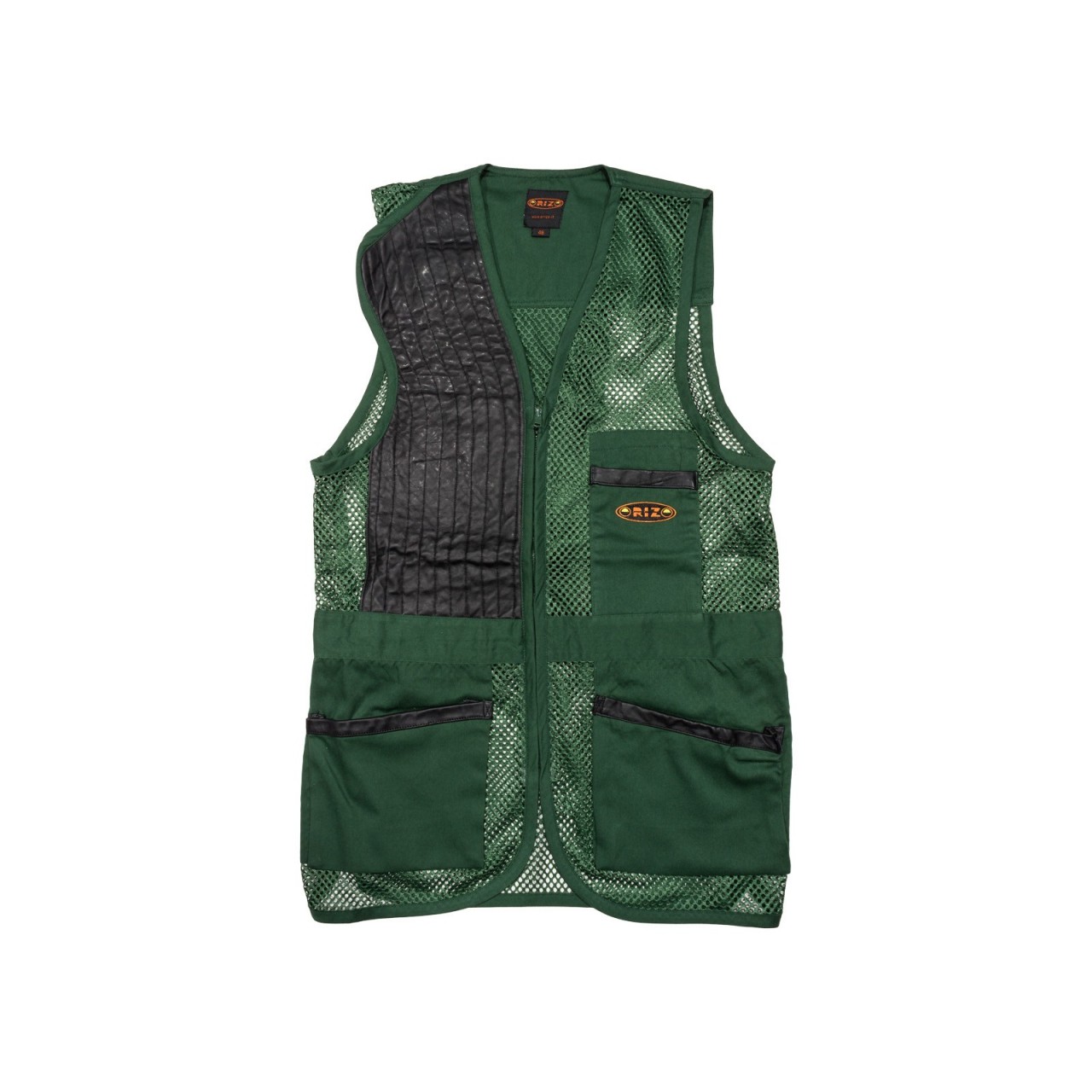 Gilet Marchiato Orizo realizzato in 100% poliestere tessuto a rete e tessuto 100% cotone da 240 gr/mq. Paracolpi in pelle che assicura adeguata protezione contro il rinculo e impunture antiscivolo, con uno spacco sulla parte superiore della spalla che consente maggiore spazio per l?appoggio del calcio del fucile. Ad altezza vita si trova un cinturino in tessuto di cotone che sul giro schiena contiene un elastico che permette, assieme agli spacchetti laterali, di ottimizzare la vestibilità. Chiusura frontale per mezzo di una zip a scomparsa, con due robuste e ampie tasche laterali a soffietto, bordate in pelle, che consentono di contenere un gran numero di cartucce e con, sulla parte sinistra sopra al cinturino, un taschino porta oggetti anch?esso bordato in pelle. Sul retro, in posizione che segue la colonna vertebrale, si trova una fascia di rinforzo in tessuto di cotone così come dello stesso materiale è composta la fascia che va dalla nuca alle spalle, spazio ideale per ospitare eventuali ricami personalizzati.