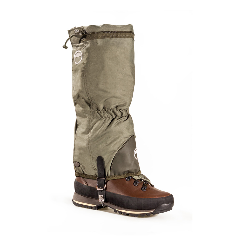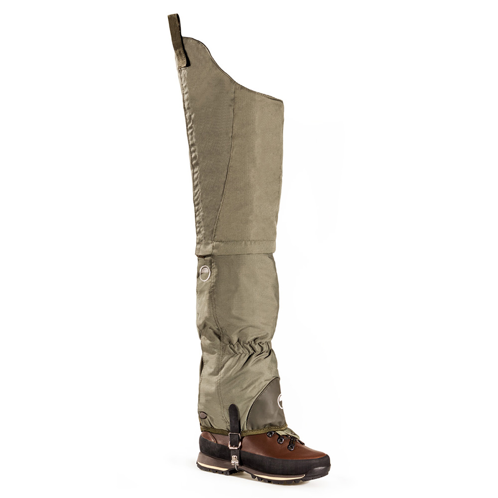 Ghette 2in1, Marchiate Orizo, con cosciali staccabili realizzati in corduta resistente completamente antistrappo con Rip-Stop. Le Ghette sono impermeabili al 100% grazie alla spalmatura di PU ed ha una chiusura laterale con velcro e cerniera YKK. Ha inoltre l'elastico al tallone e al polpaccio e un cordino di restringimento sulla parte superiore. Il cavetto sotto tacco è in acciaio e regolazione mediante cinturino in robusto tessuto di nylon spalmato da entrambi i lati in PVC.