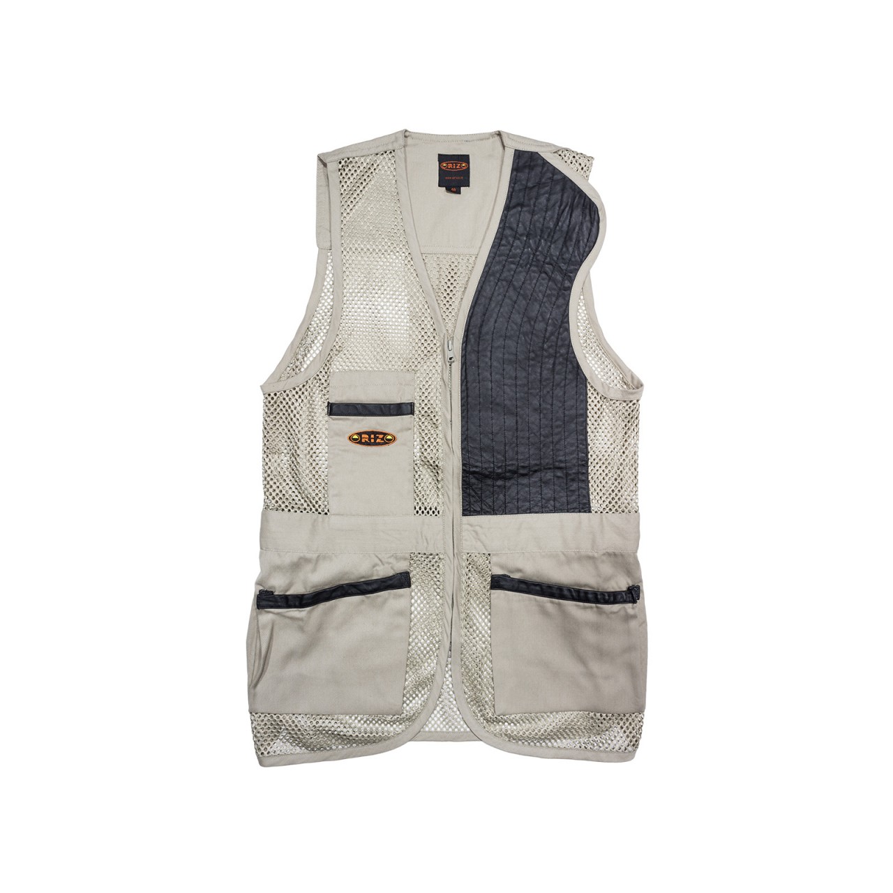 Gilet Marchiato Orizo realizzato in 100% poliestere tessuto a rete e tessuto 100% cotone da 240 gr/mq. Paracolpi in pelle che assicura adeguata protezione contro il rinculo e impunture antiscivolo, con uno spacco sulla parte superiore della spalla che consente maggiore spazio per l?appoggio del calcio del fucile. Ad altezza vita si trova un cinturino in tessuto di cotone che sul giro schiena contiene un elastico che permette, assieme agli spacchetti laterali, di ottimizzare la vestibilità. Chiusura frontale per mezzo di una zip a scomparsa, con due robuste e ampie tasche laterali a soffietto, bordate in pelle, che consentono di contenere un gran numero di cartucce e con, sulla parte sinistra sopra al cinturino, un taschino porta oggetti anch?esso bordato in pelle. Sul retro, in posizione che segue la colonna vertebrale, si trova una fascia di rinforzo in tessuto di cotone così come dello stesso materiale è composta la fascia che va dalla nuca alle spalle, spazio ideale per ospitare eventuali ricami personalizzati.