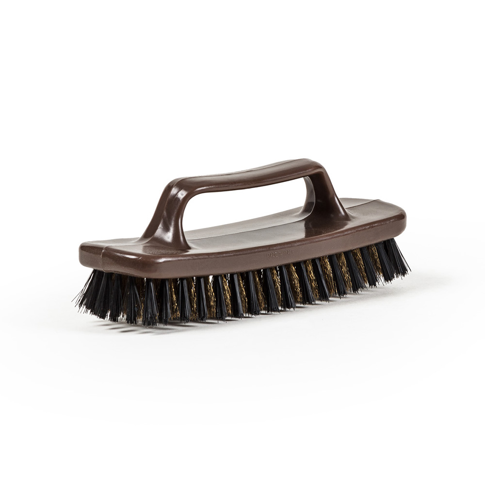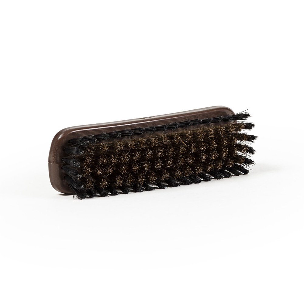 Spazzola dura con setole in ottone per calzature in pelle scamosciata.